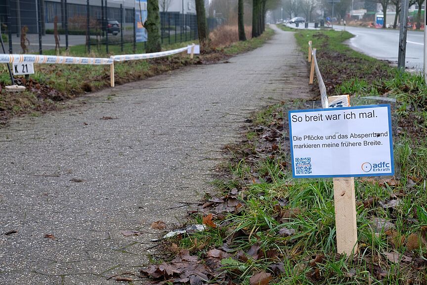Rückblick: 27.02.2021. Der Allgemeine Deutsche Fahrrad-Club (ADFC) Erkrath gräbt ein Stück des Fuß- und Radwegs an der Hochdahler Straße (K21) gegenüber der Schönen Aussicht frei und startet damit die Aktion „Radweg ausgraben“. Binnen einer Woche zog der Bauhof des Kreises Mettmann nach und legte den gesamten Abschnitt zwischen den Einmündungen Timocom-Platz und Bessemer Straße frei. Allerdings auch nur oberflächlich und lieblos. Und es blieb leider bei einer einmaligen Aktion. Der Fuß- und Radweg verlotterte wieder.