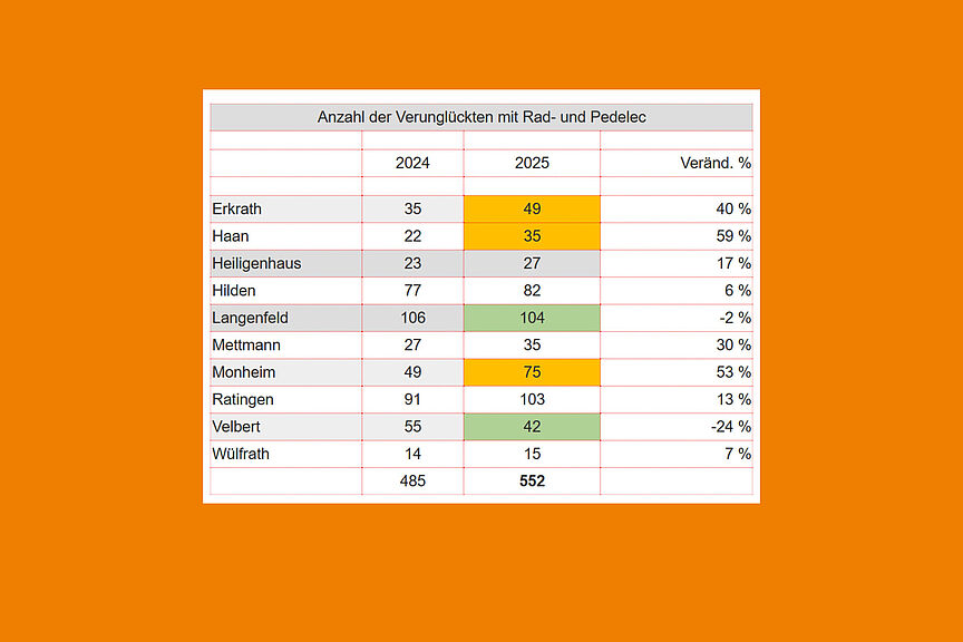 weiter angestiegen. Besonders bei den Rad- und Pedelecunfällen zeigen sich in den Städten Erkrath, Haan und Monheim deutliche Zuwächse bei den Verletztenzahlen. Erfreulich sind die Zahlen aus Langenfeld und Velbert, die eine Verringerung der Verletztenanzahl zu verzeichnen hatten.