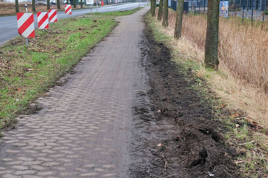 Deshalb mussten die Aktiven des ADFC gleich zu Beginn des neuen Jahres am 08.01.2022 wieder anrücken und gruben den Radweg an der Hochdahler Straße, diesmal an der Ecke Timocom-Platz beim ehemaligen Impfzentrum, aus. Auch in diesem Fall wurde innerhalb einer Woche vom Kreis im gesamten Streckenabschnitt nachgearbeitet. Und wieder oberflächlich und lieblos. Stellenweise liegt die Erde immer noch auf der Verkehrsfläche.