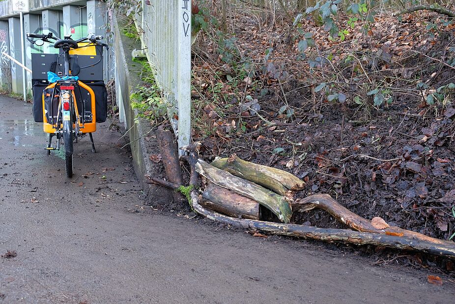 Auf einem Stück von gut 5m Länge schaufelten ADFC-Aktive den Einmündungsbereich frei und türmten Dreck und Matsch zu einem recht ansehnlichen Haufen auf. Dieser liegt nun seit einer Woche zur Abholung bereit... Zusätzlich errichteten sie eine provisorische Holzkonstruktion, die deutlich machen soll, wie das Hangende abgesichert werden müsste, damit Erde bei Regenfällen nicht wieder ungehindert auf den Weg fließen kann.